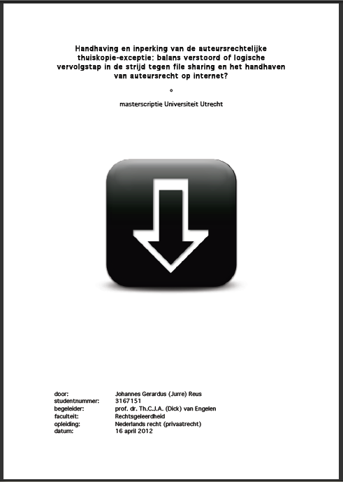 J.G. Reus, Handhaving en inperking van de auteursrechtelijke thuiskopie-exceptie: balans verstoord of logische vervolgstap in de strijd tegen file sharing en het handhaven van auteursrecht op internet? Universiteit Utrecht 2012.