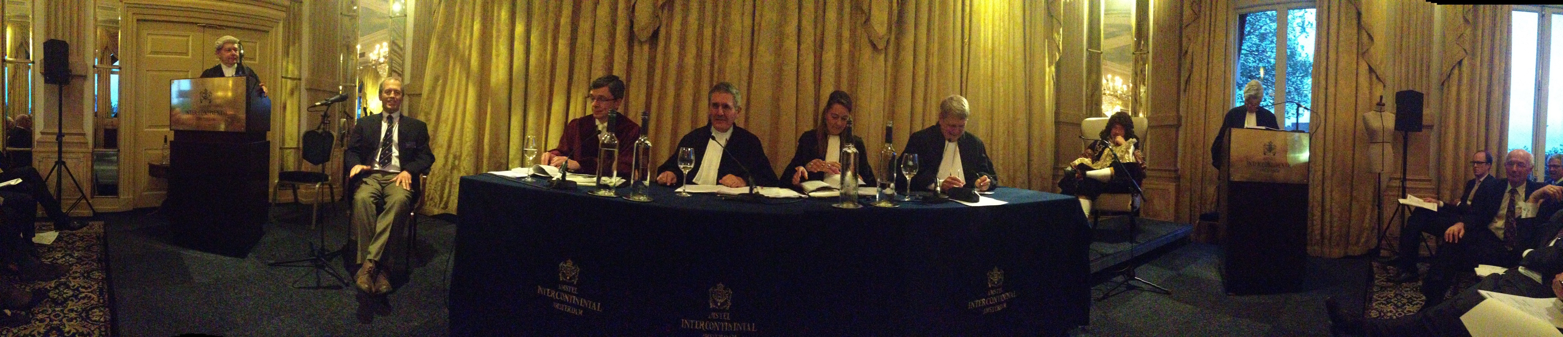 V.l.n.r.: attorney Carr, "witness" Lamb, BGH-richter Grabinski, (former) Court of Appeal Sir Jacob, Hof Den Haag mr. Kalden, professor Willem Hoyng, "president" Strowel en advocaat Hendrick. Foto: Joris van Manen