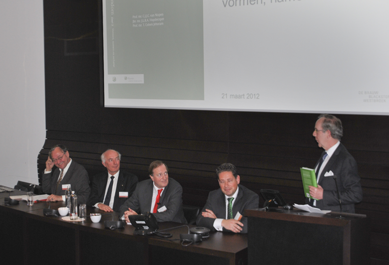 Gisterenmiddag werd het boek Industriële Eigendom deel 3, vormen, namen en reclame gepresenteerd, ten kantore van De Brauw Blackstone Westbroek, wat geen toeval is: de auteurs zijn daar alle werkzaam (geweest). Na een historische beschouwing door Toon Huydecoper (waarin Piet Helbach natuurlijk een prominente rol speelde), reikte Constant van Nispen het eerste exemplaar uit aan de Directeur-Generaal van het Benelux Bureau voor de Intellectuele Eigendom, de heer Simon. Het boek werd onmiddellijk al van een bespreking voorzien door A-G professor Verkade, die alle hoofdstukken (modellenrecht, handelsnaamrecht, domeinnamen, ongeoorloofde mededinging, misleidende en vergelijkende reclame, oneerlijke handelspraktijken en geografische herkomstaanduidingen) de revue liet passeren.