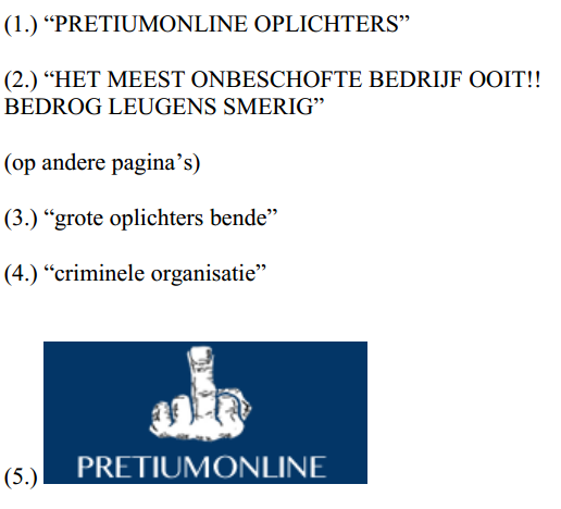 Domeinnaamrecht. Onrechtmatige uitingen. Klaagsite. Pretium is een Nederlands telecommunicatiebedrijf dat sinds 1996 actief is als aanbieder van vaste telecommunicatiediensten in Nederland. Blijkens www.newice.nl, de website van X c.s., legt Newice zich ook toe op de registratie van domeinnamen, het ontwerpen van websites en de hosting daarvan. De websites met de domeinnamen www.pretiumonline.com en www.pretiumonline.nl kenden aanvankelijk onder meer de volgende uitingen: (1.) “PRETIUMONLINE OPLICHTERS” (2.) “HET MEEST ONBESCHOFTE BEDRIJF OOIT!! BEDROG LEUGENS SMERIG”, etc..