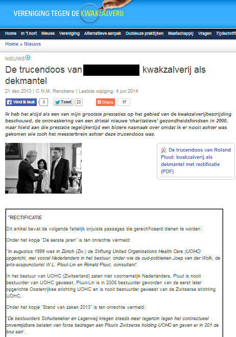 Mediarecht. Rectificatie van uitspraken over eisers in het blad van de vereniging tegen de kwakzalverij. Op de voorkant van de aflevering van het Tijdschrift staat een tekening van waarop een op eiseres gelijkende man en vrouw met een rietje uit een collectebus drinken. Er zijn foto's geplaatst bij het artikel met de titel "De trucendoos van [eiser]: kwakzalverij als dekmantel". Volgens de Vereniging Tegen de Kwakzalverij c.s. is eiser al in een vroeg stadium bij de oprichting van een groot aantal ‘goede doelen’ organisaties betrokken, onder meer door zich garant te stellen voor bepaalde uitgaven.