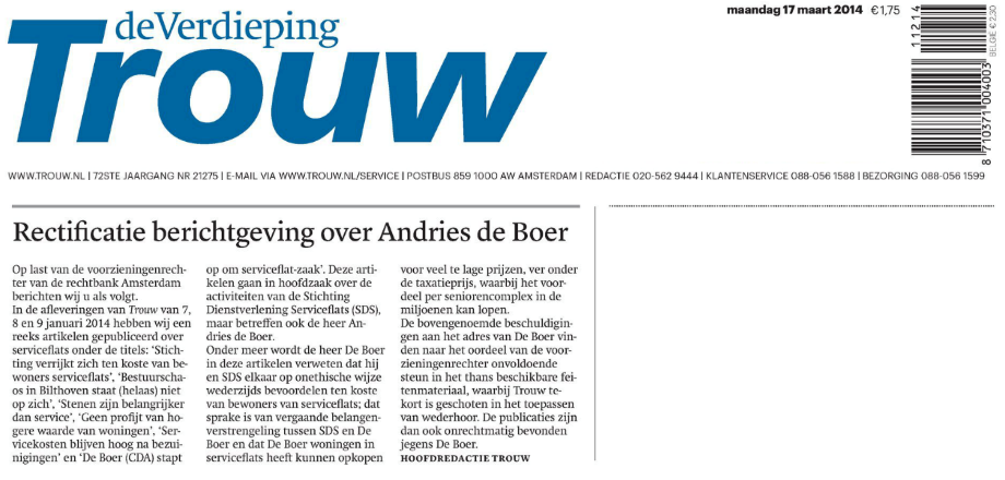 Mediarecht. Onrechtmatige publicaties. De Boer is vastgoedinvesteerder en politicus in Noordwijk. Trouw wordt bevolen onrechtmatige berichtgevingen over hem (hier/hier/hier) te rectificeren op de voorpagina van een doordeweekse krant, niet de zaterdageditie, nu de te rectificeren artikelen op doordeweekse dagen zijn verschenen.