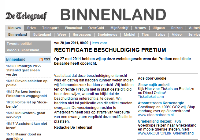 Als randvermelding. Mediarecht. Rectificatie van een onrechtmatig artikel 'Blinde bejaarde keihard belazerd' in een dagblad (De Telegraaf) en verschillende aan dat dagblad gekoppelde digitale media, zoals facebook en twitter. Moeilijkheden bij digitale rectificatie. (afbeelding voor vergroting)