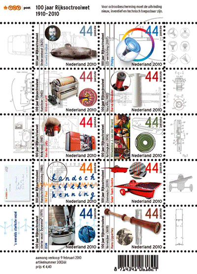 ‘Op donderdag 11 februari 2010 is in de kunsthal in Rotterdam tijdens een feestelijke bijeenkomst officieel het eerste velletje octrooipostzegels uitgereikt. TNT post maakte, naar aanleiding van een aanvraag van de heer G. Kleisterlee van Philips en mevrouw M. Van der Hoeven, minister van Economische Zaken, tien speciale octrooipostzegels, naar aanleiding van het jubileumjaar van de Rijksoctrooiwet.