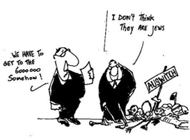 Een cartoon van de Arabisch-Europese Liga (AEL) refereerde aan de suggestie dat joden de holocaust (voor hun eigen gewin) hebben verzonnen. Op de cartoon staan twee orthodoxe Joden naast een aantal lijken bij een bordje ‘Auswitch’. De een zegt tegen de ander, die een optelling bestudeert: ‘I don’t think they are Jews’, waarop de ander met het papier antwoordt: ‘We have to get to the 6000000 somehow.’ Er volgde een strafzaak wegens belediging tegen de AEL, die de cartoon op haar website plaatste.