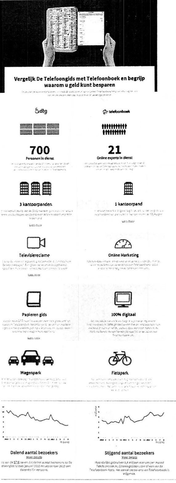 Uitspraak ingezonden door Linda Eijpe, Skoop Advocaten en Annelies van Zoest, Zoest Legal. Onjuiste en misleidende, ongeoorloofde vergelijkende reclame (6:194(a) BW). Merkenrecht. Telefoonboek exploiteert telefoonboek.nl en telefoongidsopzegweken.nl. Zij adverteert met "van Gids naar Boek kan u honderden euro's besparen" met een "volledige vergelijking" onder meer van het aantal medewerkers en het wagenpark (klik op afbeelding links). DTG onderneemt meer dan alleen het uitgeven van de papieren Gids en de website en daarom is een vergelijking tussen de ondernemingen in een productvergelijking niet relevant. Het aanbieden van een opzegmogelijkheid is niet als onrechtmatig aan te merken.