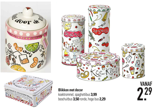 Van Geffen is medeontwerpster van de afbeeldingen die zijn aangebracht op de producten van onder meer aardewerk en textiel. Blond c.s. brengt de productlijn 'Even bijkletsen' op de markt. Xenos verkoopt in haarwinkels voorraadbussen, koektrommels enz. met de teksten 'gezellig zo samen een beschuitje eten', soms voorzien van een geel en roze rand.